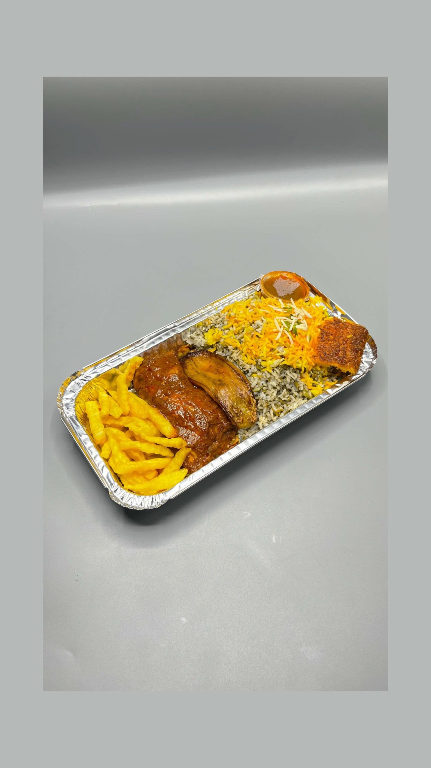 برنج400 گرم باقالی 50 گرم شوید 70 گرم ران مرغ 400 گرم(سس پز) سیب زمینی سرخ شده بادمجان سرخ شده