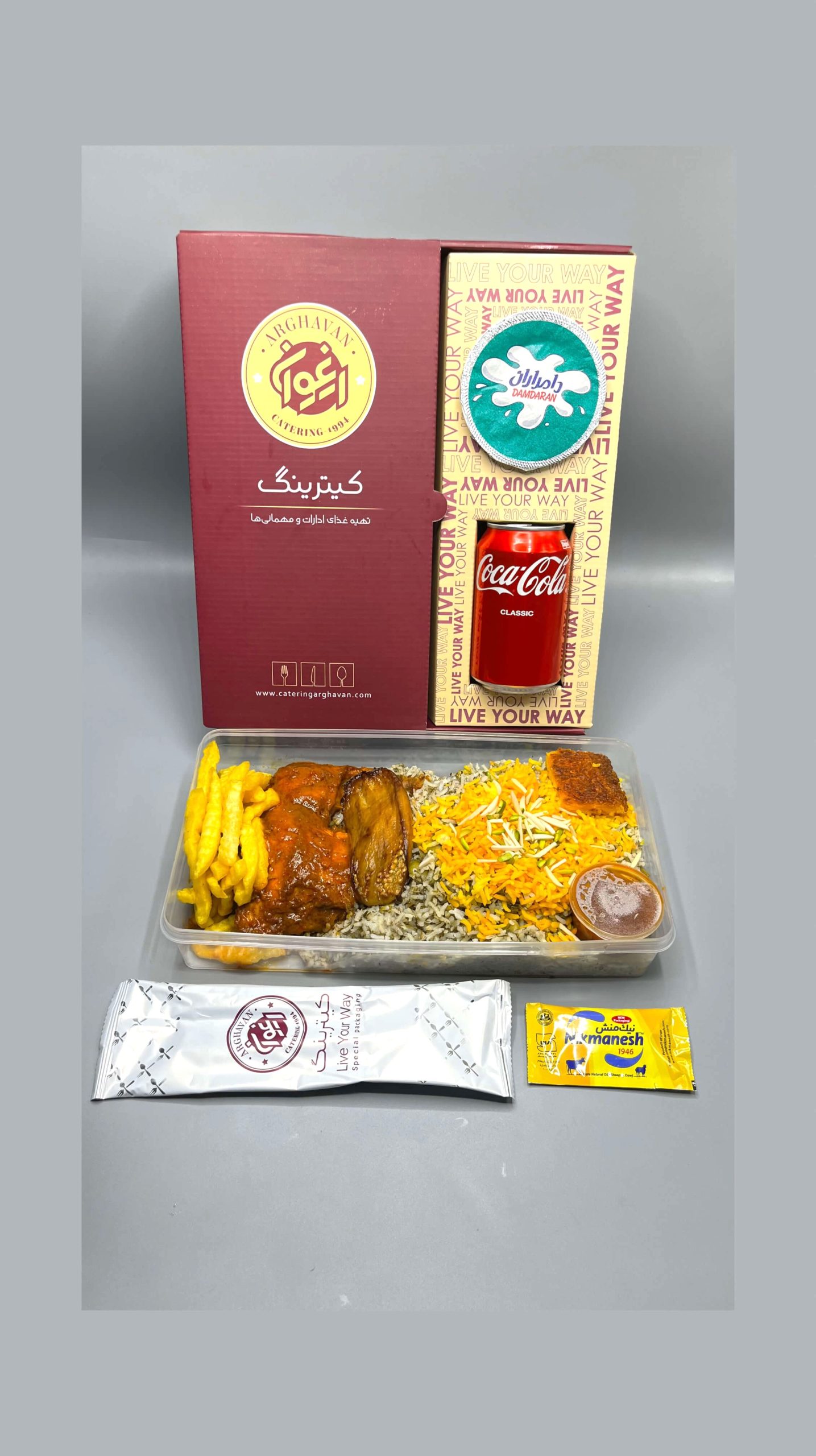 برنج400 گرم باقالی 50 گرم شوید 70 گرم ران مرغ 400 گرم(سس پز) سیب زمینی سرخ شده بادمجان سرخ شده به همراه بسته بندی نوشابه قوطی ماست موسیر قاشق و چنگال
