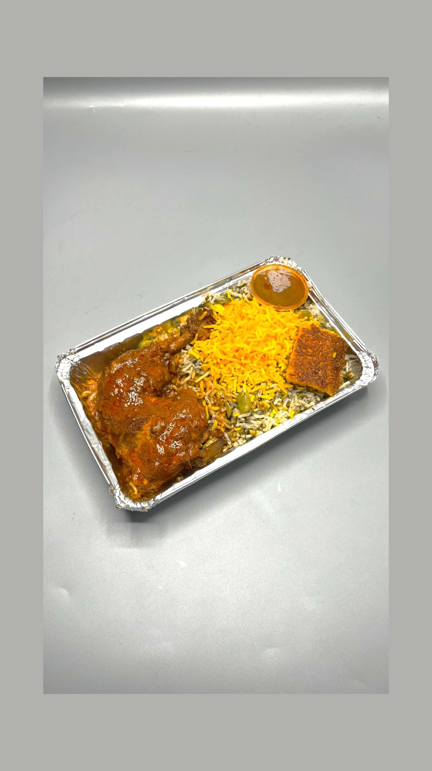 برنج 400گرم باقالی 50گرم شوید70 گرم ران مرغ400گرم(سس پز)