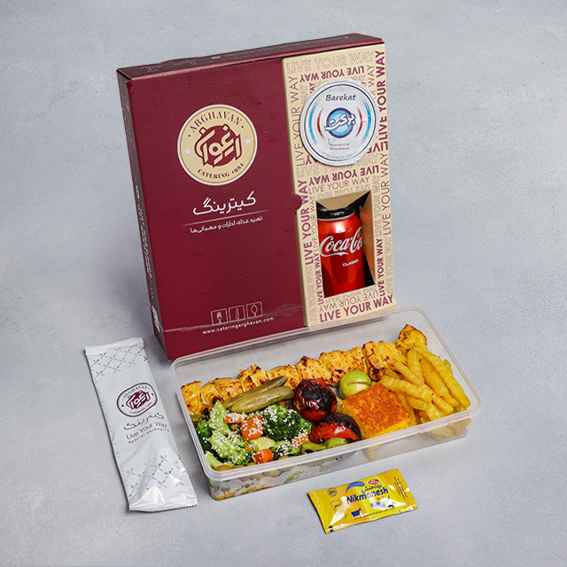 سینه جوجه 300 گرم،گوجه کبابی،فلفل کبابی،به همراه دورچین مخصوص،ته دیگ، کره،لیمو ترش،به همراه بسته بندی:نوشابه قوطی،ماست موسیر،قاشق و چنگال ظرف ماکروویوی
