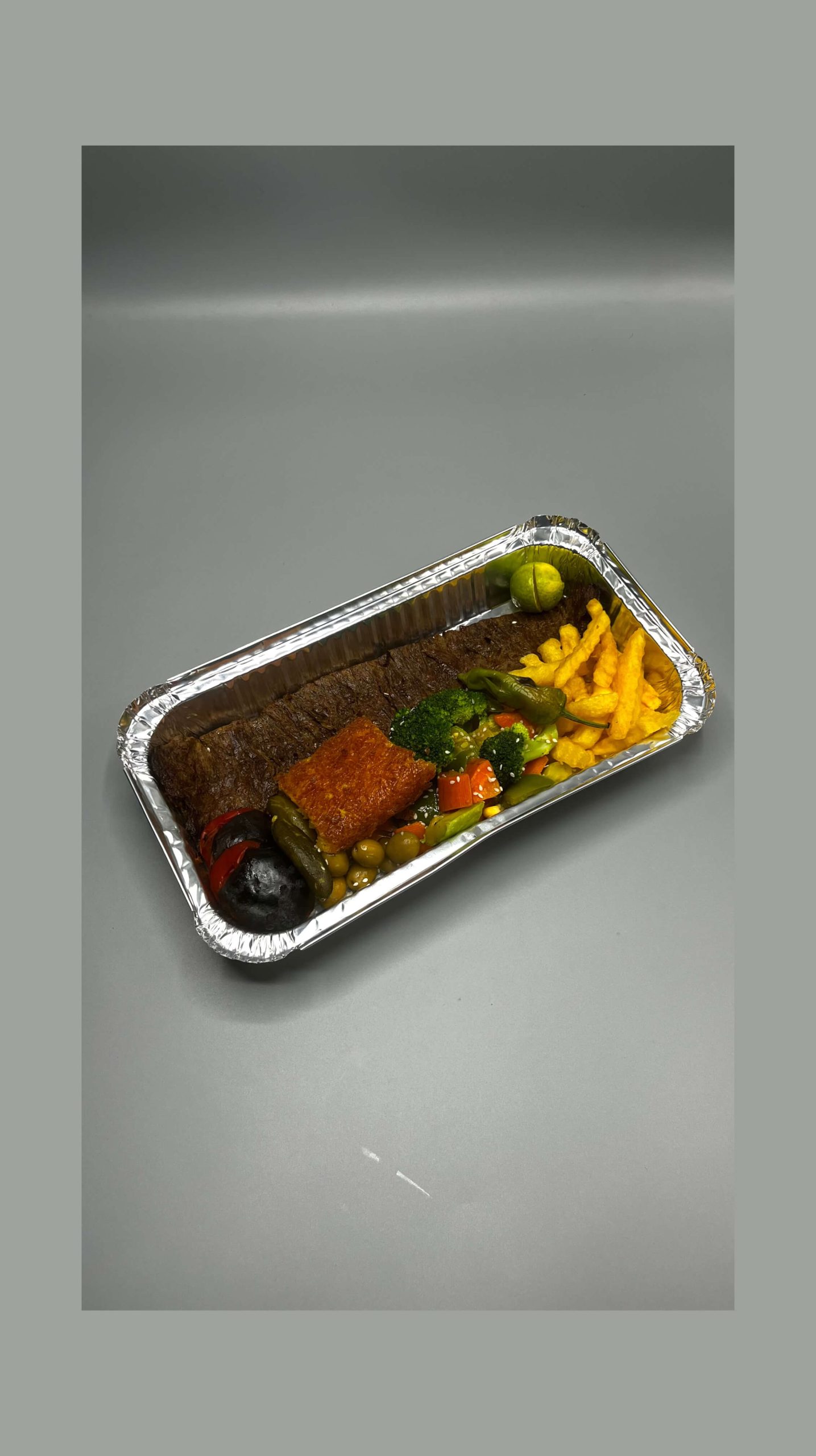یک سیخ فیله گوساله 180 گرم دورچین:گوجه،سبزیجات،فلفل کبابی،ته دیگ،لیمو ترش،کره