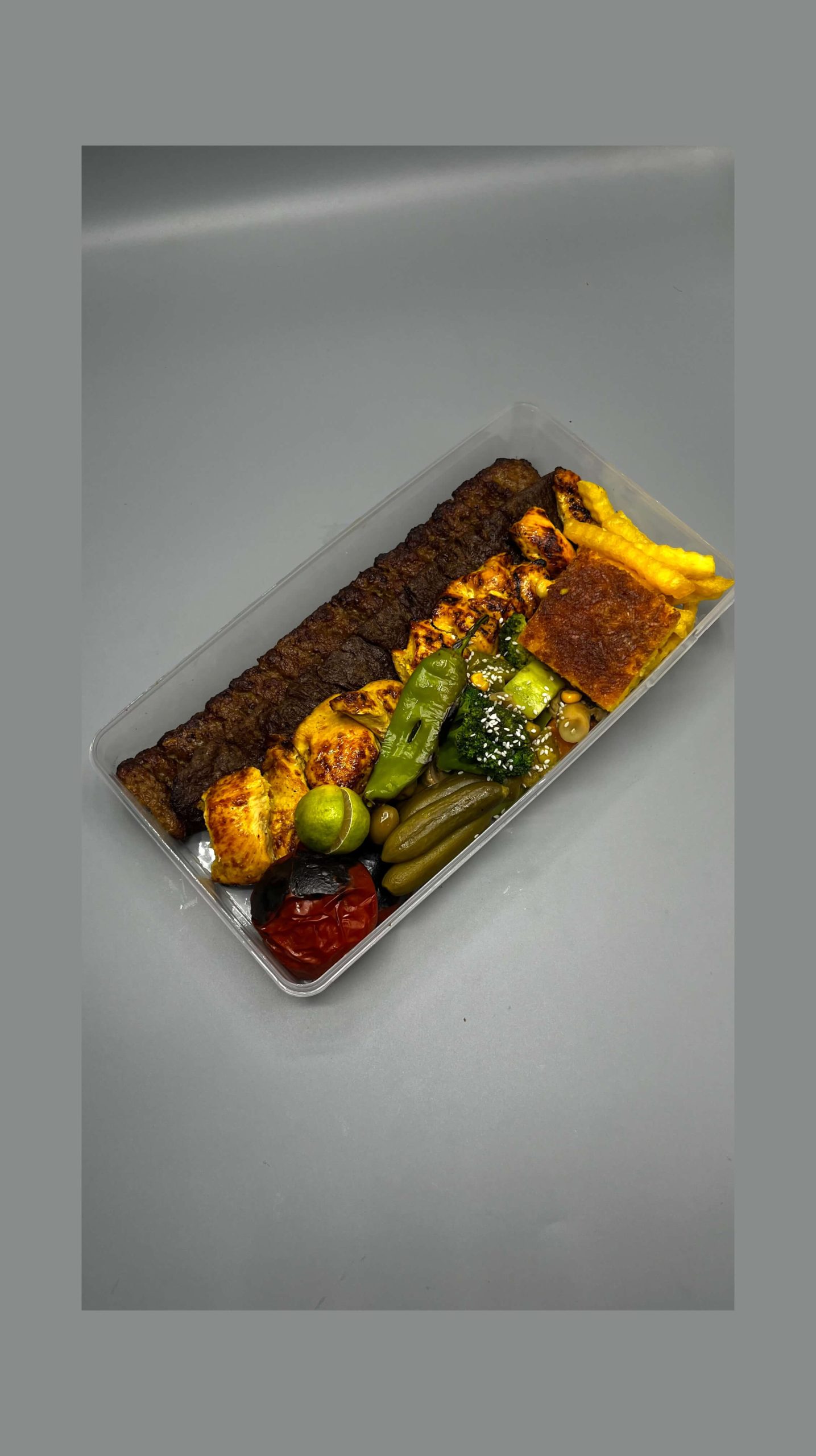 1سیخ برگ 200 گرمی راسته گوساله +1سیخ لقمه230 گرمی مخلوط گوسفندی و گوسله+1سیخ جوجه 300 گرمی سینه مرغ+دورچین مخصوص{سبزیجات،سیب زمینی،گوجه،فلفل کبابی،زیتون،خیارشور،کره،ته دیگ،لیموترش یا نارنج}
