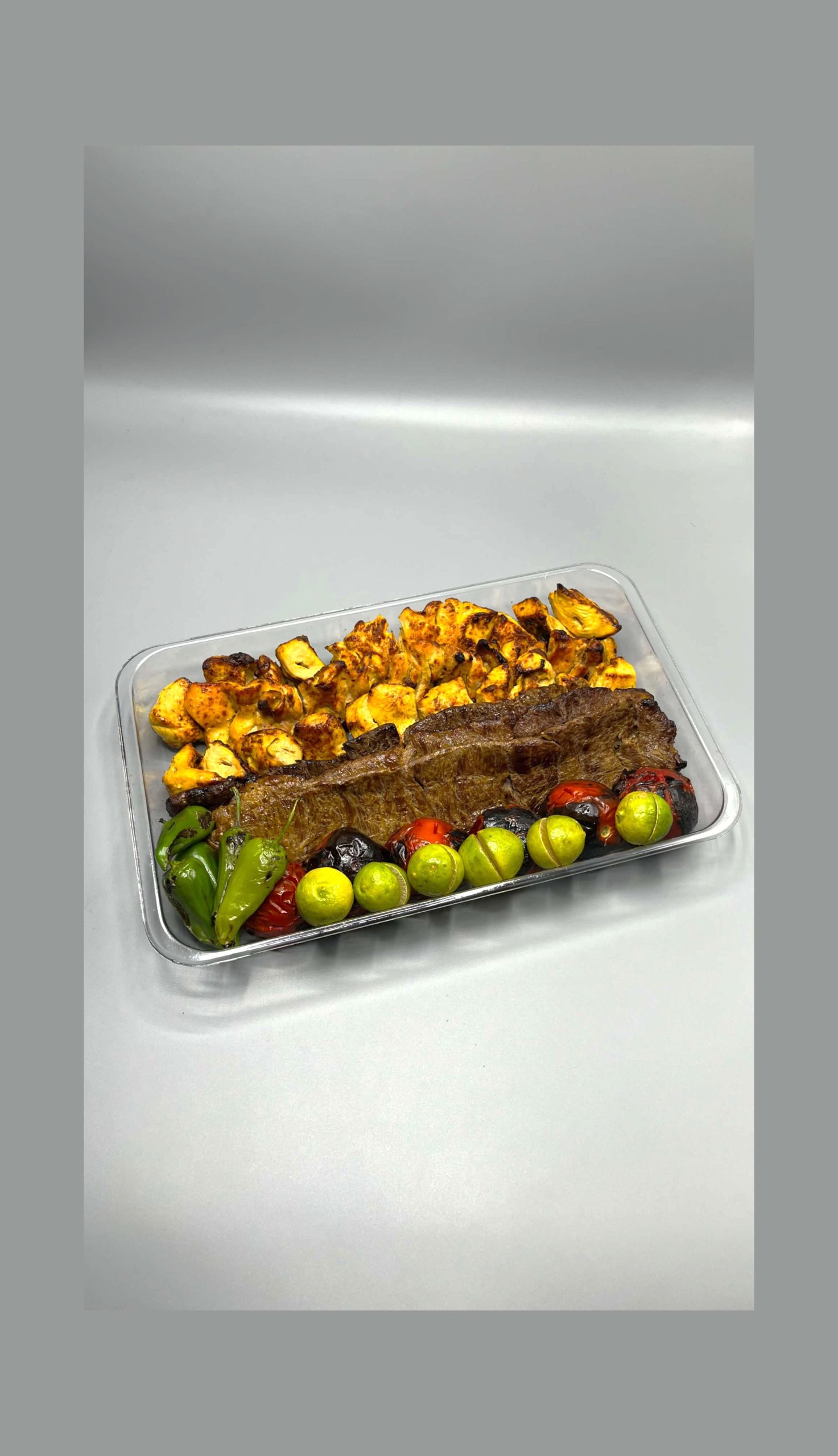 3سیخ برگ گوساله180گرم+3سیخ جوجه سینه یا ران 300گرم+گوجه کبابی+فلفل کبابی+لیموترش یا نارنج+ظرف پیرکس بزرگ