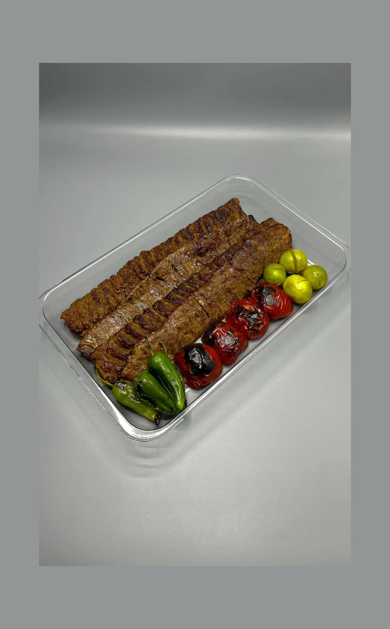 2سیخ برگ گوساله180گرم+2سیخ لقمه 230 گرم مخلوط گوسفندی و گوساله+گوجه کبابی+فلفل کبابی+لیموترش یا نارنج+ ظرف پیرکس بزرگ
