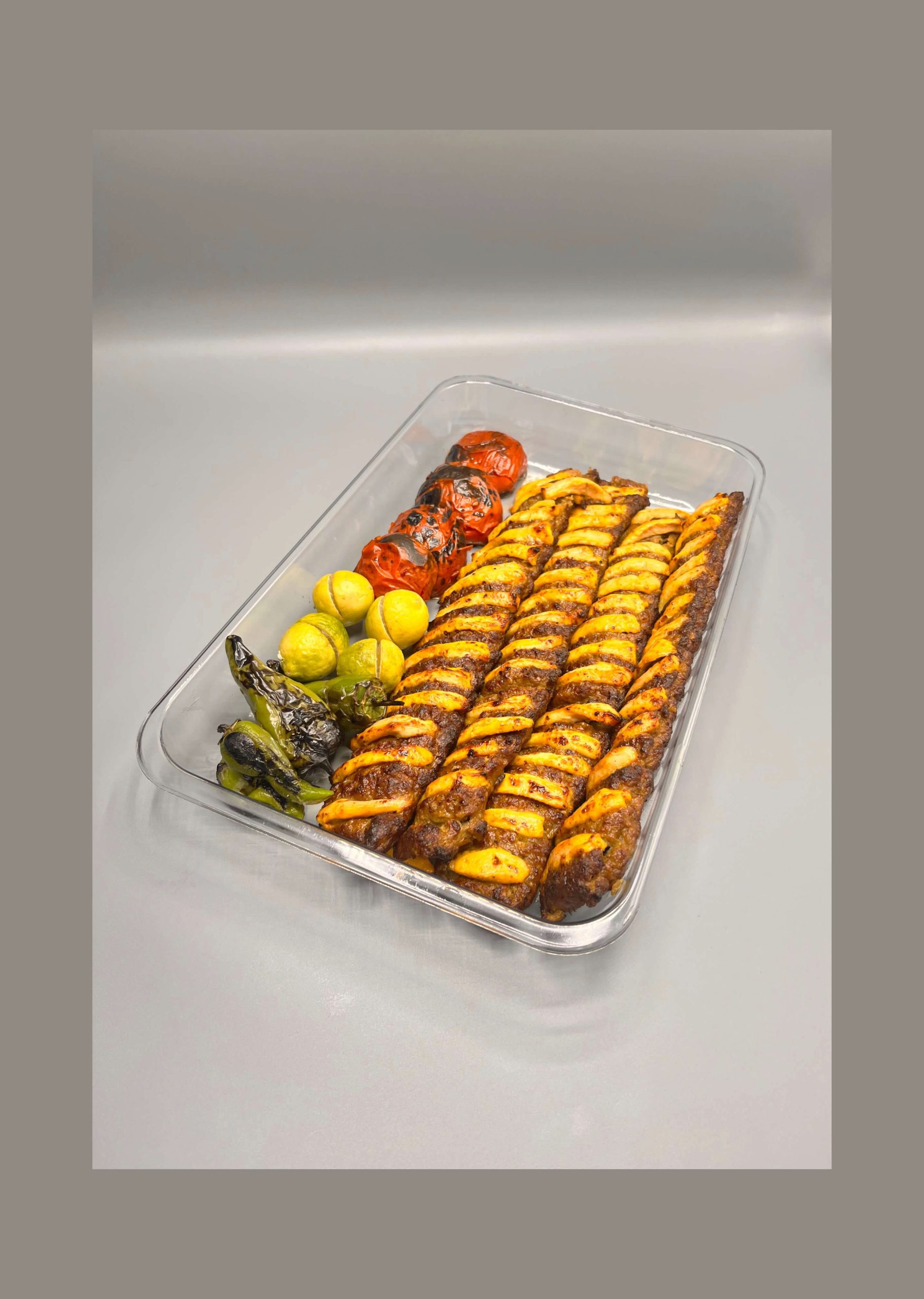4 سیخ 230گرم لقمه مخلوط گوسفندی و گوساله+40 گرم سینه مرغ +گوجه+ فلفل کبابی+کره+ سماق+لیموترش یا نارنج+داخل ظرف پیرکس