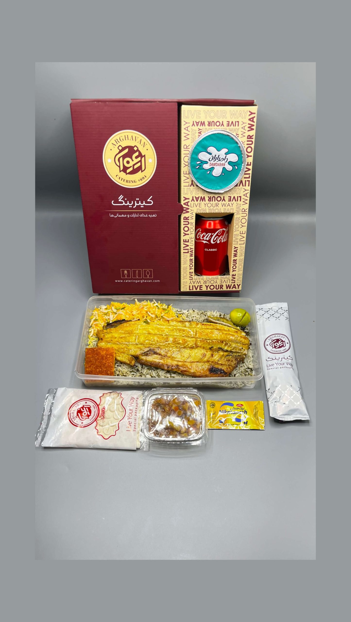 برنج پخته 400 گرم ، 250 گرم فیله ماهی قزل آلا کبابی،ته دیگ، لیموترش،به همراه ترشی و پک بسته بندی:نوشابه قوطی،ماست موسیر،نان و قاشق چنگال