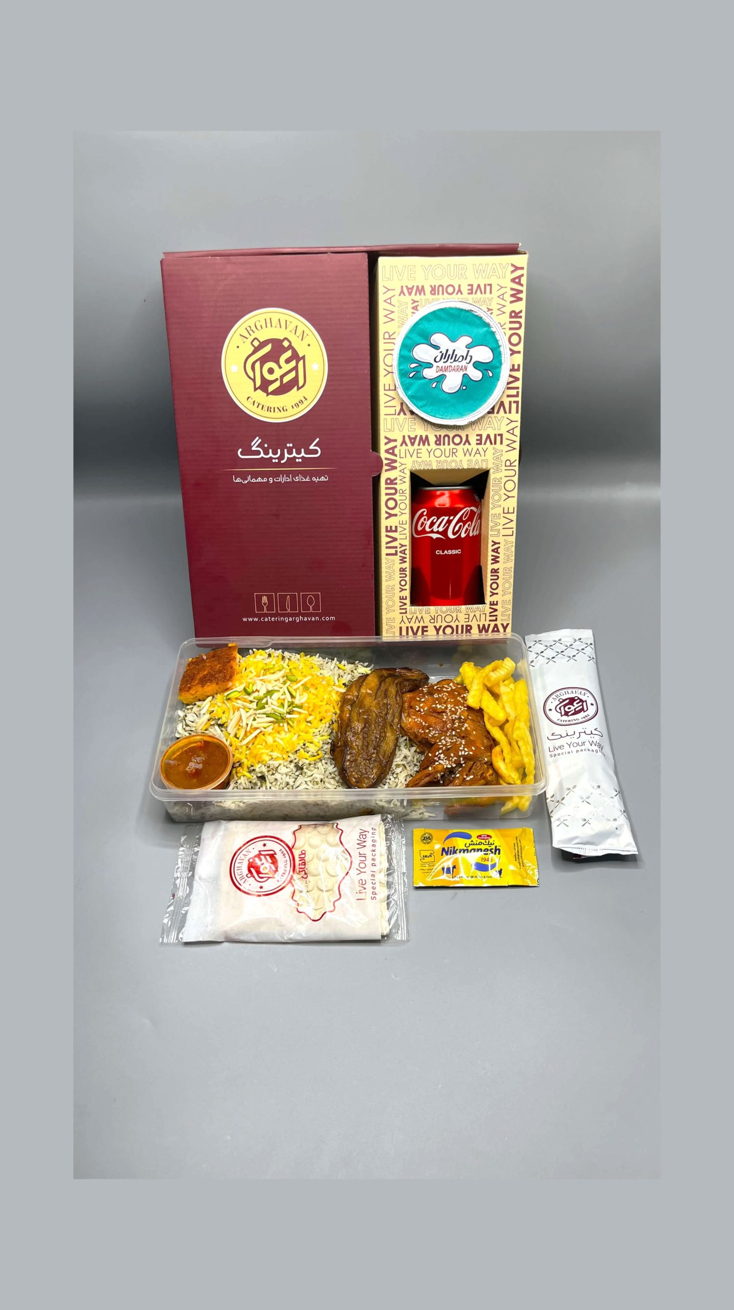 برنج400گرم،ران مرغ450گرم،نثار زرشک خلال پسته و بادام وبرنج زعفرانی،بادمجان سرخ شده،سیب زمینی سرخ شده،ته دیگ،به همراه پک بسته بندی:نوشابه قوطی،ماست موسیر،قاشق و چنگال