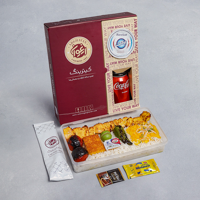 سینه جوجه 300 گرم،برنج ایرانی پخته 400 گرم،برنج زعفرانی،گوجه ،فلفل کبابی،ته دیگ،کره ،لیمو ترش به همراه بسته بندی:نوشابه قوطی ، ماست موسیر،قاشق و چنگال