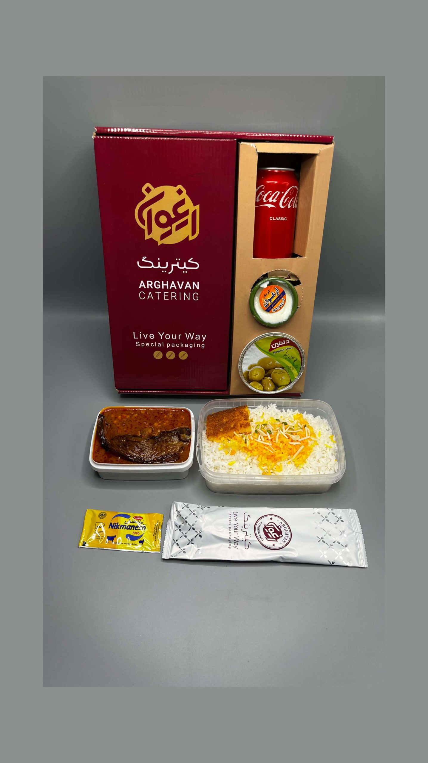 450گرم برنج ایرانی+70 گرم گوشت گوساله+270 گرم خورشت+40گرم برنج زعفرانی+ته دیگ+ بسته بندی{ظرف ماکروفری،نوشابه قوطی،ماست کوزه ای،زیتون پرورده،روغن کرمانشاهی،نان،پیاز،قاشق چنگال}