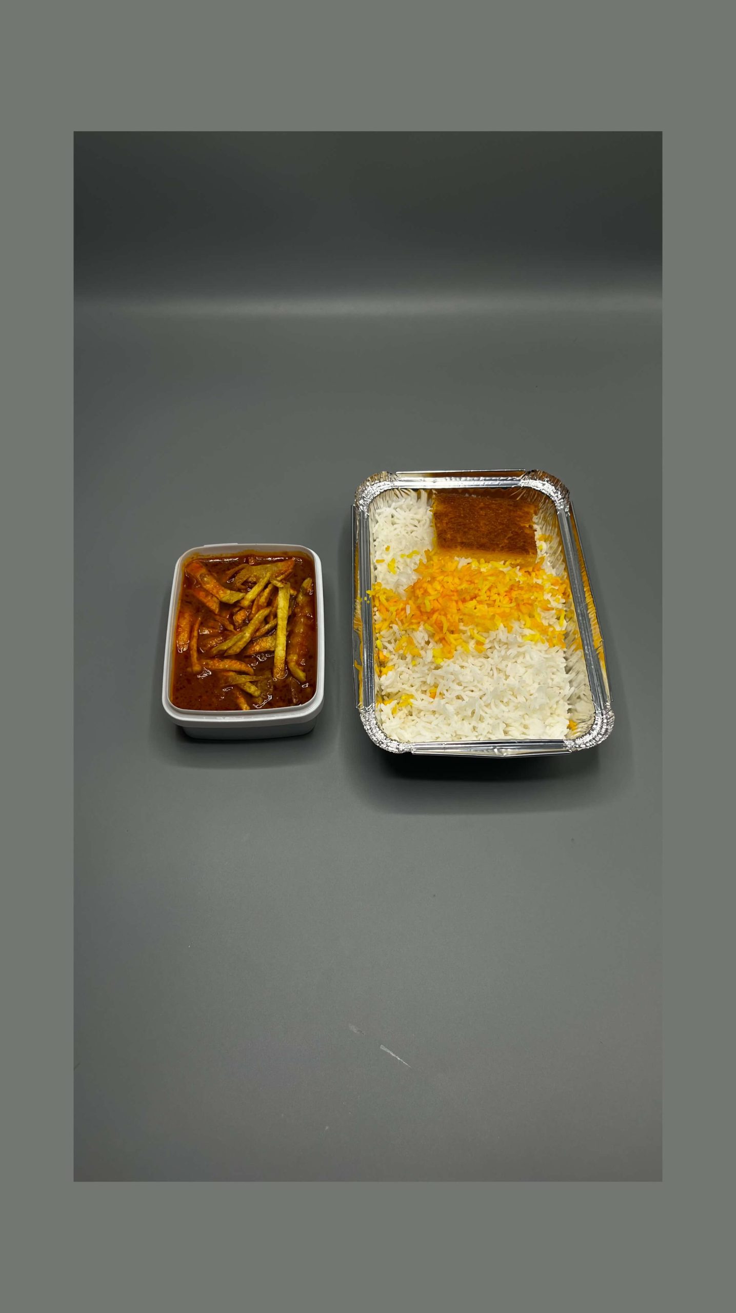 گوشت گوساله تازه 60 گرم پخته ،رب اعلاء ،برنج پخته 400 گرم ، برنج زعفرانی