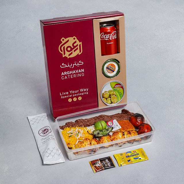 200 گرم برگ فیله گوساله+250 گرم سینه مرغ+550 گرم برنج ایرانی+35 گرم نثار+ته دیگ+گوجه+فلفل کبابی+کره+سماق+لیموترش یا نارنج+بسته بندی{ظرف ماکروفری،نوشابه قوطی،ماست کوزه ای،زیتون پرورده،روغن کرمانشاهی،نان،پیاز،قاشق چنگال}