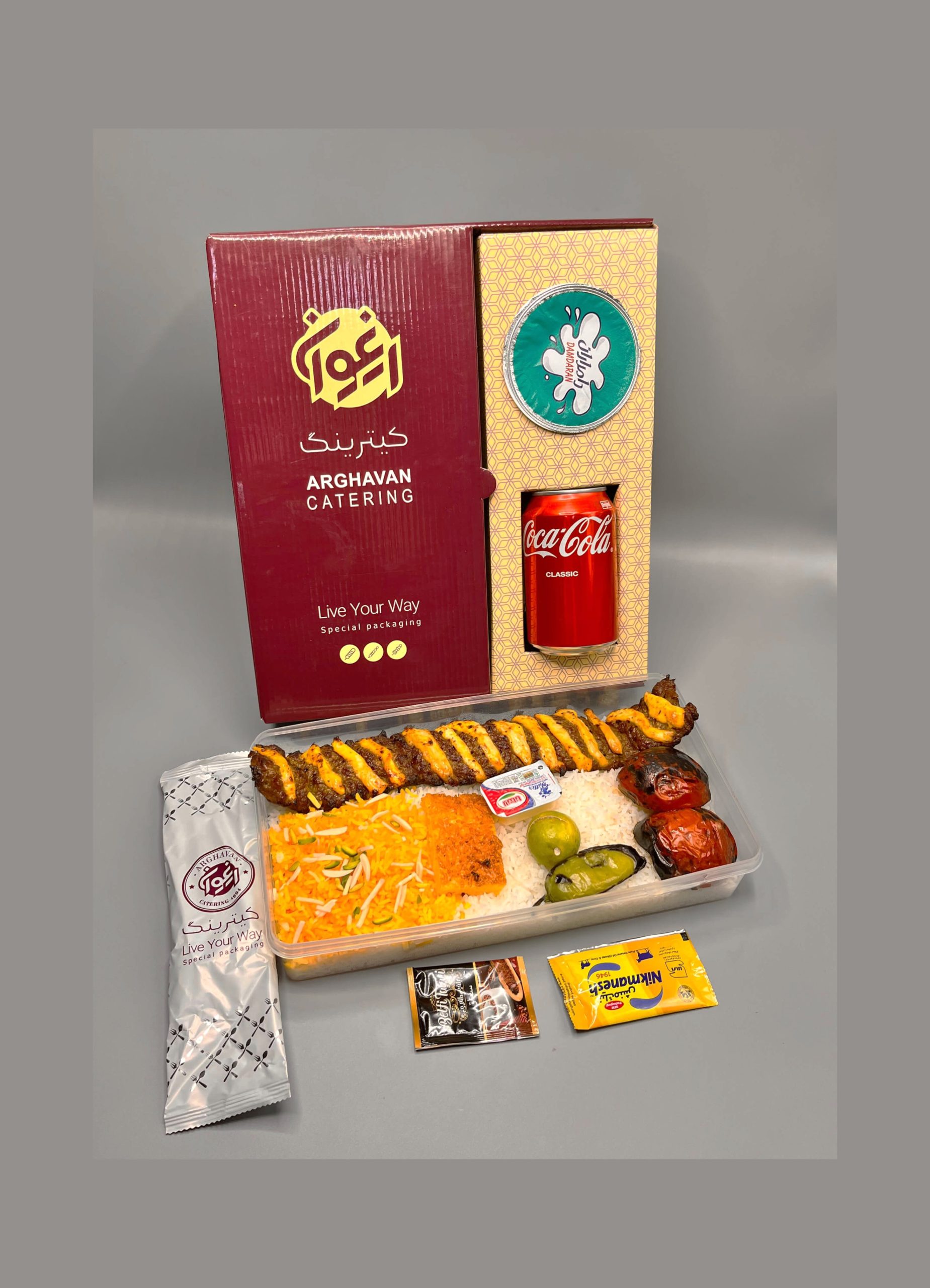 230گرم لقمه مخلوط گوسفندی و گوساله+40 گرم سینه مرغ +550 گرم برنج ایرانی+60 گرم نثار+ته دیگ+گوجه+ فلفل کبابی+کره+ سماق+لیمو یا نارنج+بسته بندی{ظرف ماکروفری،نوشابه قوطی،ماست موسیر،روغن کرمانشاهی،نان،پیاز،قاشق چنگال}